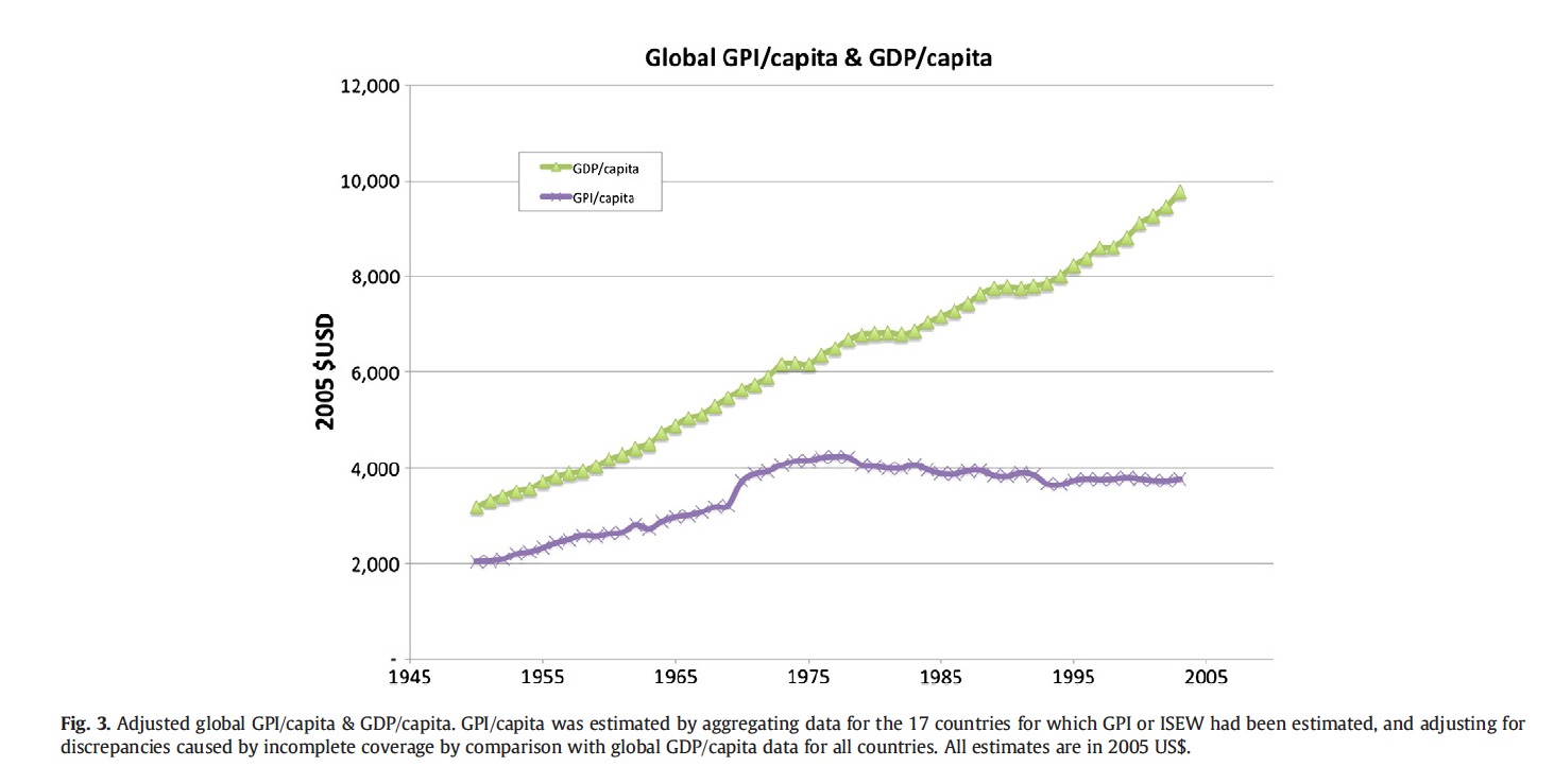 In a fascinating new study, called “Beyond GDP: Measuring and achieving global genuine progress” some researchers have looked at how different countries in the world have done in their GPI all the way back to 1950.  What did they find?  In contrast to GDP, which has been soaring for the past 70 years, they found that GPI peaked worldwide in 1978 and has been falling ever since.  This seems to confirm what many of us have been feeling instinctively for some time – that while our politicians and promoters of the global capitalist economy tell us that we’ve “never had it so good,” the real welfare of people worldwide has been in a state of decline.